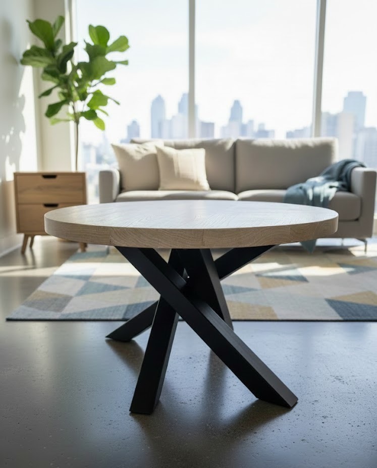 ► Okrągły stolik kawowy łączący naturalne piękno dębu z surowym charakterem stali.